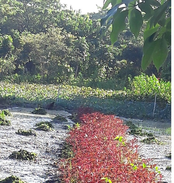 The red leaf amaranth growing in the floating garden (at a low water time) is a super-nutritious food!